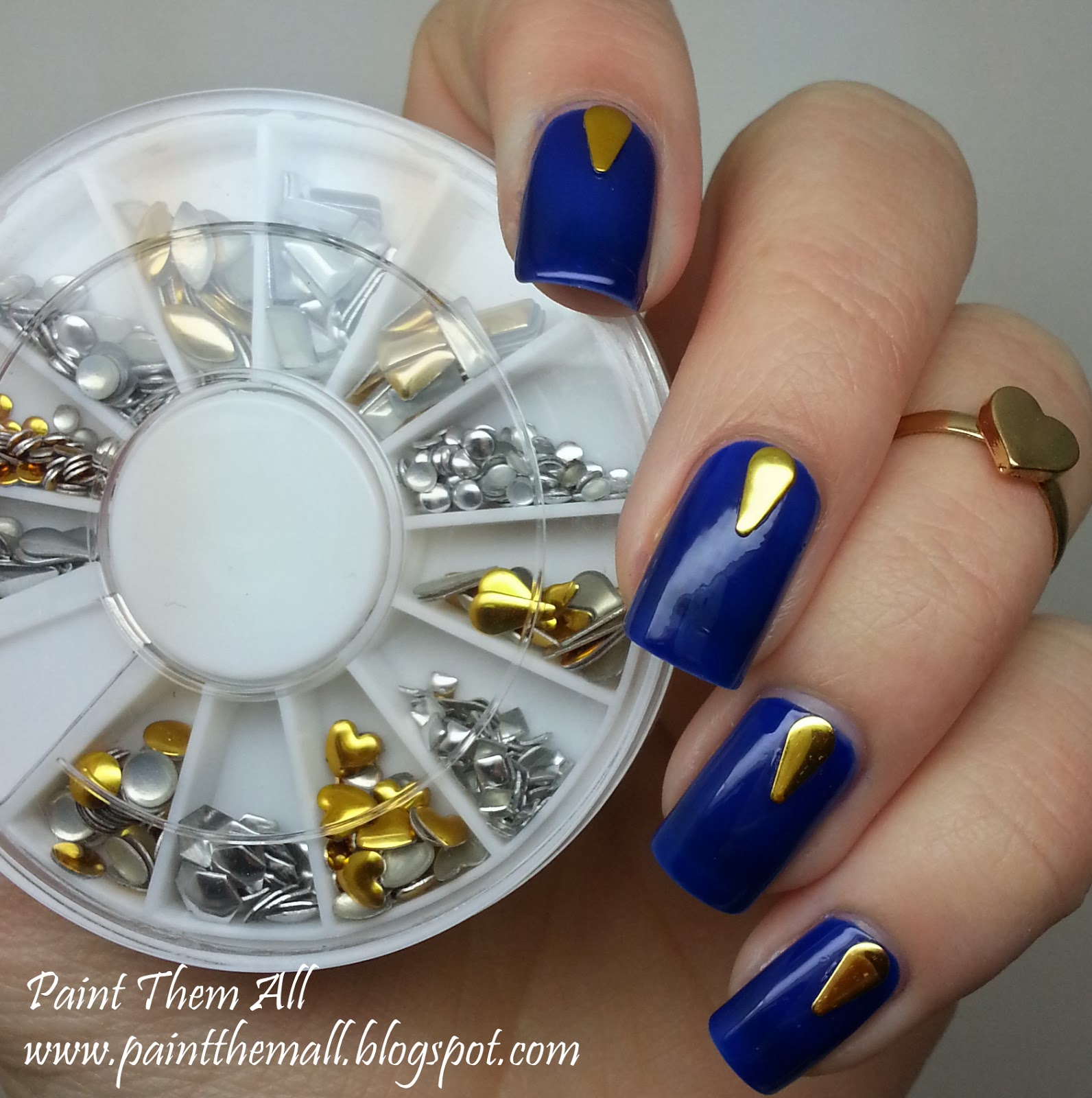הוספתי קישוט של ניטים מטאליים בצורת טיפה שקניתי בחנות Sacara וסיימתי בטופ מבריק. את הניטים אני מדביקה על הלק הרטוב, והם עמידים למשך יו-יומיים. לאחר מכן קחו בחשבון שחלק מהם ייפלו רנדומלית, בלי שתשימו לב. אני יודעת שיש בנות שמדביקות אותם עם דבק ציפורניים ואז הם לא נושרים סתם ככה, אבל זה נראה לי אגרסיבי מדי ואני קצת מפחדת לנסות.
